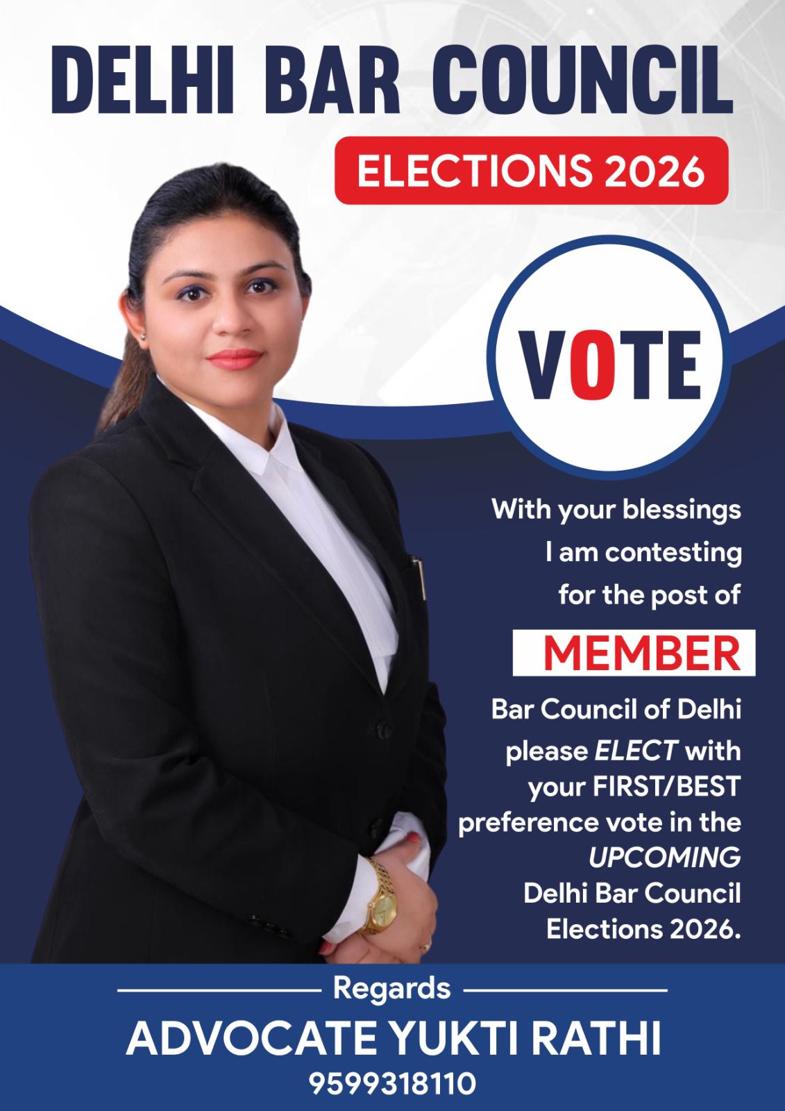 Advocate Yukti Rathi’s professional journey is defined by transparency, consistency, and service. She approaches the Delhi Bar Council Elections 2026 not merely as a candidate, but as a committed member of the Bar — a colleague, a sister, and a trusted voice within the fraternity.